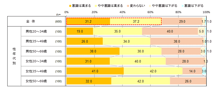 ・性年代別でみると男性20~34歳が、「意識は高まる」「やや意識は高まる」の合計が54.0%と最も低い。