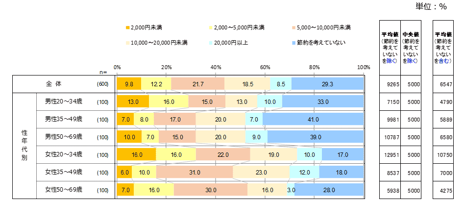 ・「節約を考えていない」という回答を除いて、節約したい額の中央値は、全体・各性年代別において全て5,000円であった。