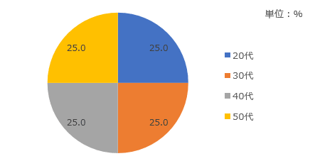 | 割付 | 【性別】男性:50.0%、女性:50.0% 【年代】20代:25.0%、30代:25.0%、40代:25.0%、50代:25.0% |