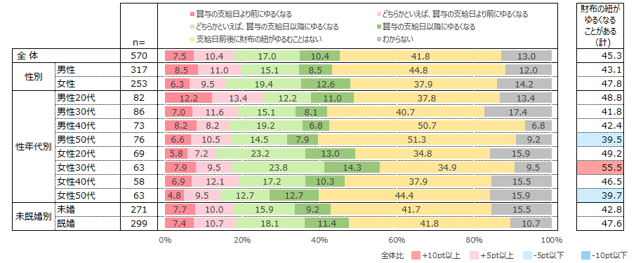 夏のボーナスが支給される見込みの回答者に、ボーナスの支給前後で財布の紐がゆるくなることがあるか答えてもらった。その結果、賞与の支給日より前にゆるくなると答えた人が17.9%、支給日以降にゆるくなると答えた人が27.4%で、合わせて45.3%となった。支給日前後にゆるむことはないと答えた人も41.8%と4割を占め、ゆるむ人とそうでない人がおよそ半々という結果になっている。