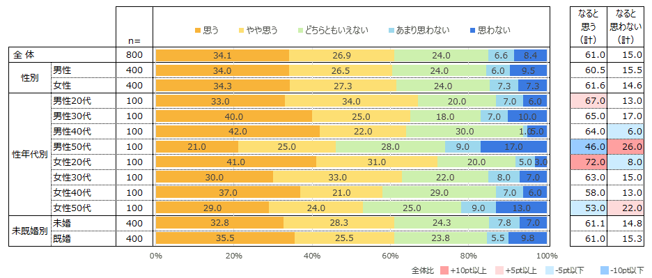 男女差は見られず、性年代別では、女性20代で「思う(計)」が72.0%と最も高く、男性50代は46.0%で最も低かった。