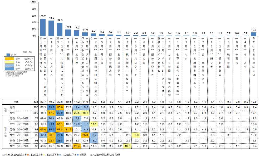 ・全体では「お正月におせち・雑煮など正月料理を食べる」50.7%が最も高く、「クリスマス」46.2%、「大晦日に年越しそばを食べる」39.6%と続く。