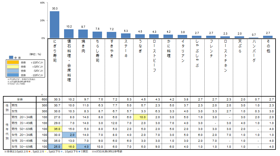 ・全体では「にぎり寿司」30.3%が最も高く、「懐石料理・会席料理」10.2%、「焼き肉」9.7%、「ちらし寿司」7.5%、「すきやき」7.2%と続く。上位5つのうち、「にぎり寿司」「懐石料理・会席料理」「ちらし寿司」と和食への人気が高い結果となり、以上3つの計は48.0%と約半数となる。