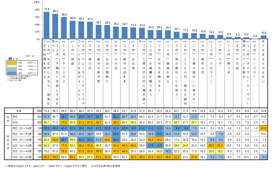 ・全体では「お正月におせち・雑煮など正月料理を食べる」73.8%が最も高く、「大晦日に年越しそばを食べる」68.3%、「クリスマス」59.5%と続く。