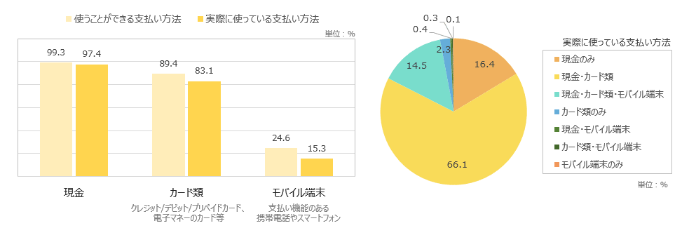 普段の買い物で【使うことができる支払い方法】と【実際に使っている支払い方法】をそれぞれ答えてもらった。
