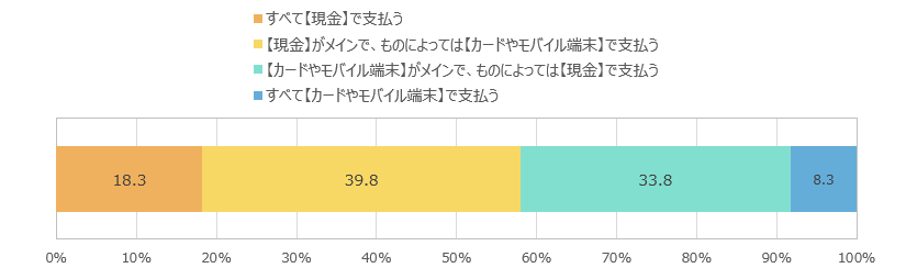 現金、カード類、モバイル端末といった複数の支払い方法について、自分が理想的だと思う使い方を答えてもらったところ、「すべて【現金】で支払う」は18.3%で、2割弱であった。「【現金】がメインで、ものによっては【カードやモバイル端末】で支払う」が39.8%、「【カードやモバイル端末】がメインで、ものによっては【現金】で支払う」が33.8%となり、これらを合わせた現金とカード・モバイルの使い分けを理想的と考える回答者が全体の73.6%を占めた。現金を使わずに「すべて【カードやモバイル端末】で支払う」、キャッシュレスが理想的と答えた人は8.3%で、1割に満たなかった。