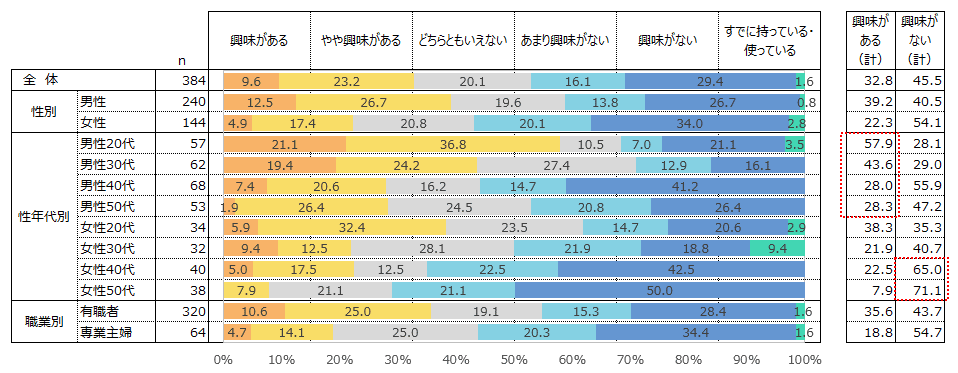 今後、仮想通貨を保有したり使用することに興味があるか聞いたところ、「興味がある」は9.6%、「やや興味がある」が23.2%で、興味ありとの回答が32.8%を占めた。反対に、「あまり興味がない」は16.1%、「興味がない」は29.4%で、興味なしとの回答は45.5%で、興味ありをやや上回った。 また、「すでに持っている・使っている」と答えた人は1.6%であった。