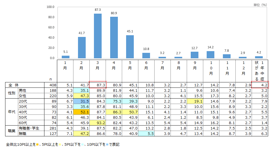 日本で花粉症にかかっている人(そう思っている人を含む)は40.8%、そのうち半数が病院を受診し、残りの半数は病院を受診せず花粉症であると感じていた。最も花粉症患者が多いのは30代で45.0%、最も少ないのは40代で36.5%であり、性別、年代別による傾向はあまり見られなかった。