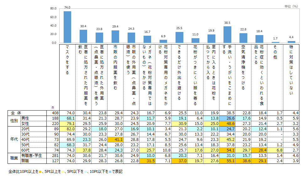 花粉症の対策として「マスクをする」人が74.0%で最も多かった。