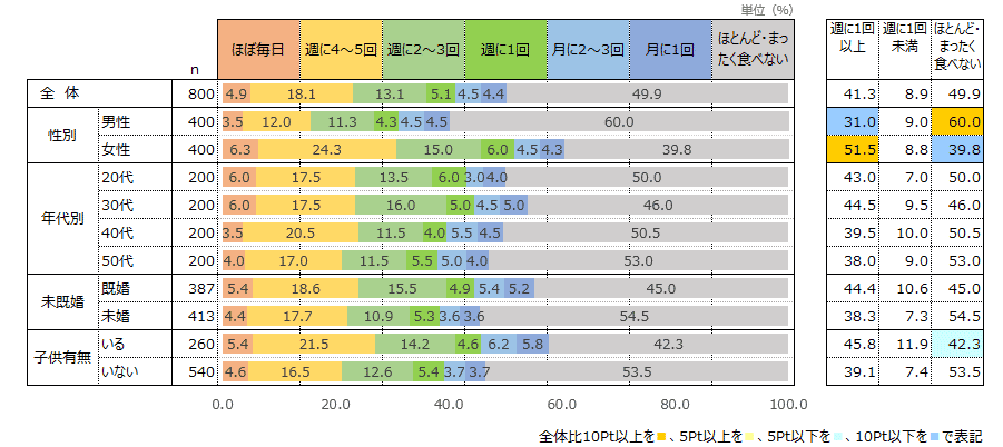 また、未婚者よりも既婚者の方が、子どものいない人よりもいる人の方が手作りのお弁当を食べる割合は高かった。