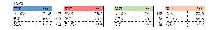 好きな麺類TOP3は「ラーメン」「うどん」「パスタ」であった。しかし、男女別に見ると男性1位は「ラーメン」、女性1位は「パスタ」となった。