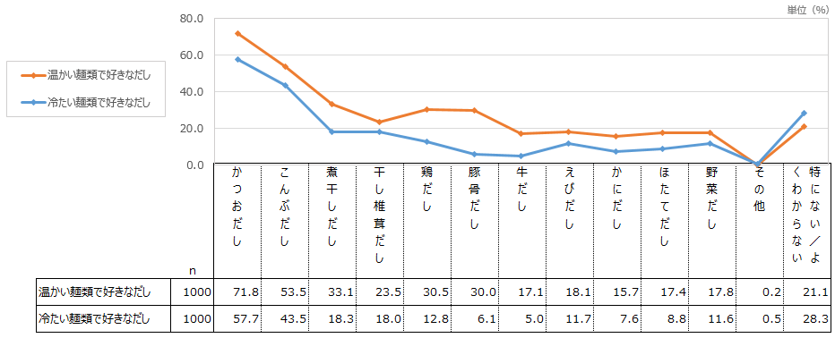 全体的に温かい麺類のだしの方が人気が高く、冷たい麺類は「特にない/よくわからない」という回答が多かった。
