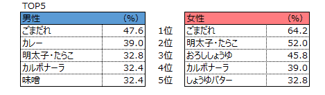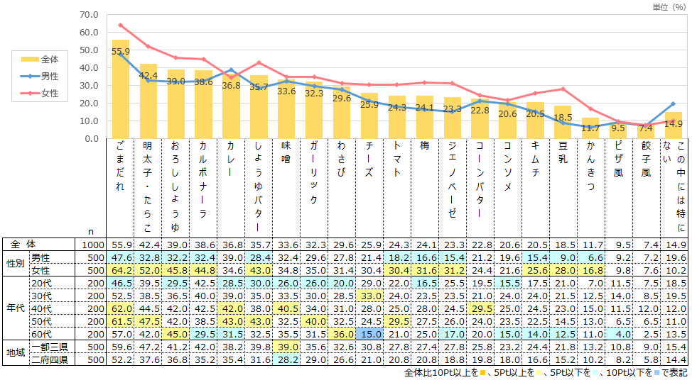 続いて「明太子・たらこ」が男性3位、女性2位の人気であったが、男女差は19.2ポイントあった。