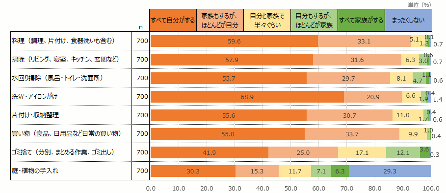 家庭での家事の分担状況は日常のほぼすべての家事で、自分(妻)がメインで担当していると回答した家庭が8割を超えた。「ゴミ捨て」と「庭・植物の手入れ」に関しては、家族がメインで担当していると回答した割合が他の家事と比べて高かった。