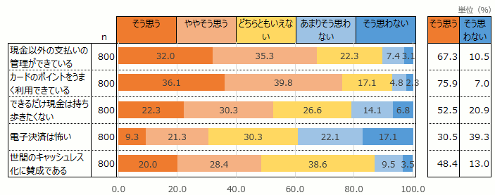 世間で浸透しているキャッシュレス化について賛否を聞いたところ、「賛成」が48.4%、「反対」が13.0%であった。項目間の関連を見ると、「できるだけ現金は持ち歩きたくない」と思っている人ほど、キャッシュレス化に賛成の人が多く、「電子決済は怖い」と思っている人ほどキャッシュレス化に反対の人が多い傾向があった。また、様々なカードで取り入れられているポイント制度に関して「カードのポイントをうまく利用できている」と回答した人は75.9%にものぼった。