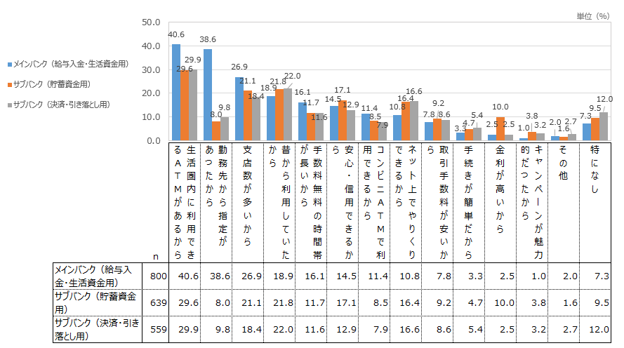 メインバンク・サブバンクを選んだ理由としていずれも「生活圏内に利用できるATMがあるから」が最も多かった。メインバンクは「勤務先からの指定」、貯蓄資金用のサブバンクは「金利の高さ」で選んでいるという回答が目立った。