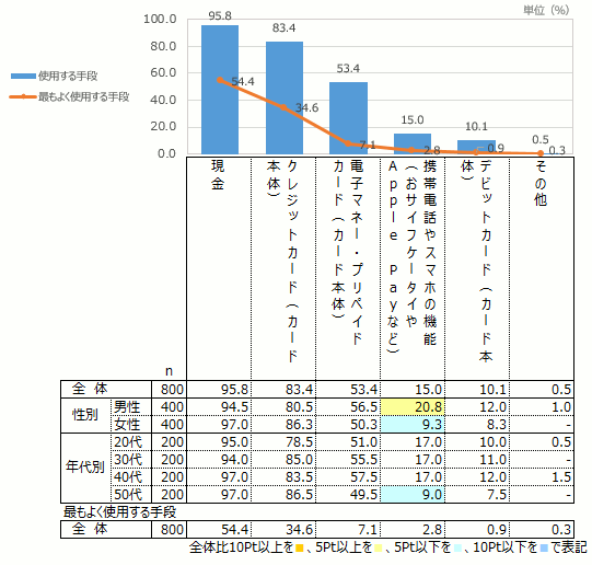 しかし最も使用頻度が高いのは「現金」で54.4%、現金を使用することはない人(キャッシュレス)はわずか4.2%であった。おサイフケータイやApple Payなどの端末機能の利用割合は女性が9.3%に対して、男性は20.8%と11.5ポイント高かった。カードが使用できない場面がある等、キャッシュレス化はまだまだ浸透していないようである。