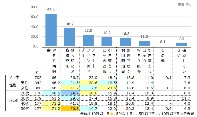 男性よりも女性の方が、また年齢が高いほど「購入時のお客様控え」や「引き落とし口座の通帳」等、手元に残るタイプで確認している割合が高い。