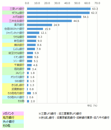 メガバンクを給与振込先に指定する企業が多いようで、メインバンクを決めた理由で「勤務先から指定があったから」と答えた人がメガバンクに多かった。