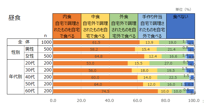 休日に朝食を摂らない人は平日の14.4%から3.2ポイント上がって17.6%であった。昼食は平日より内食や中食 の形式が増え、夕食は外食の割合が増えている。特に20代においては夕食を外食する割合が平日の12.0%から 13ポイント増え25.0%となっている。休日は昼食を家で食べ、夕食を外で食べる傾向があるようだ。