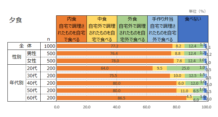 1日に摂る食事の回数を聞いたところ平日に1日3食摂ると回答した割合は76.1%、休日は72.3%であった。 一方で2食以下の割合は平日で22.9%、休日で26.1%と約4分の1が1日3食摂っていないことがわかった。 特に20代においては2食以下の割合が平日で36.0%、休日で37.0%と平均より10ポイント以上高かった。 また3食摂る割合は60代で87.0%に対し、20代は62.0%と25ポイント差があった。 平日より休日の方が3食摂らない割合がどの年代においても高いことがわかる。