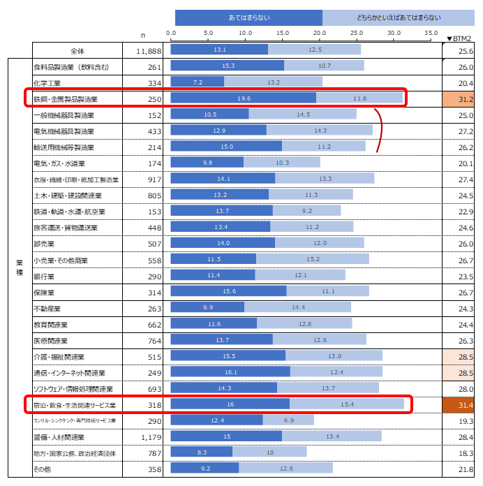 満足度同様の傾向で、業種によって、離職意向に大きな差がみられる。特に製造関連業の高さが顕著。