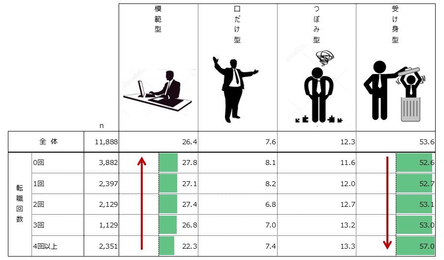 模範型社員は、転職回数3回までに多くみられ、4回以上になると急減し、受け身社員が多くなる。
