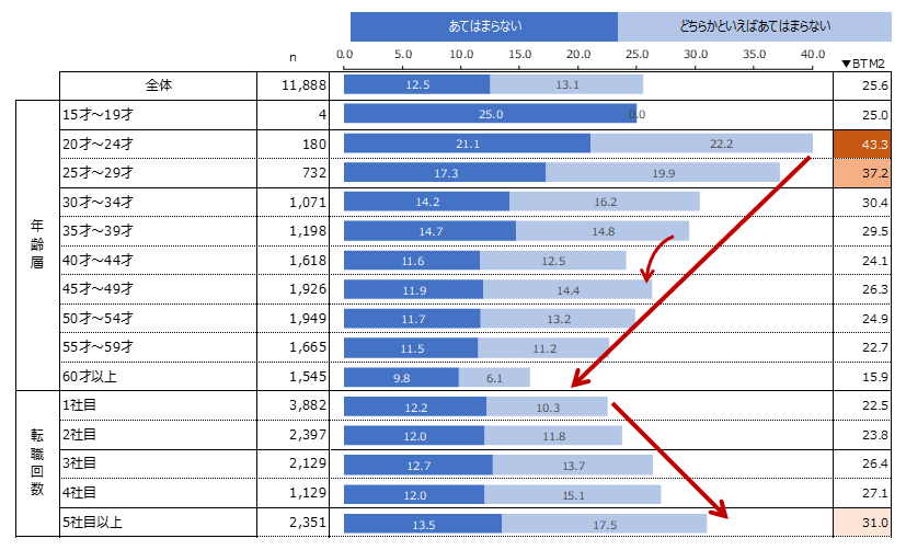 また、転職回数が多くなるほど離職意向が高くなることから、不満があって転職を繰り返している人は、転職の度に条件が悪くなっているものと推察される。
