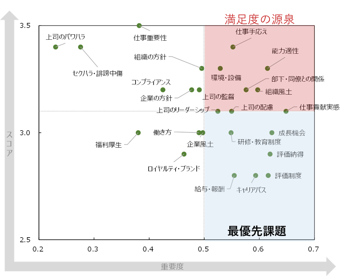 満足度への重要度と満足度のスコアで課題レベルをみると、成長できる機会の創出、納得できる評価制度の構築、キャリアパスの明確化はマストで整える必要がある。