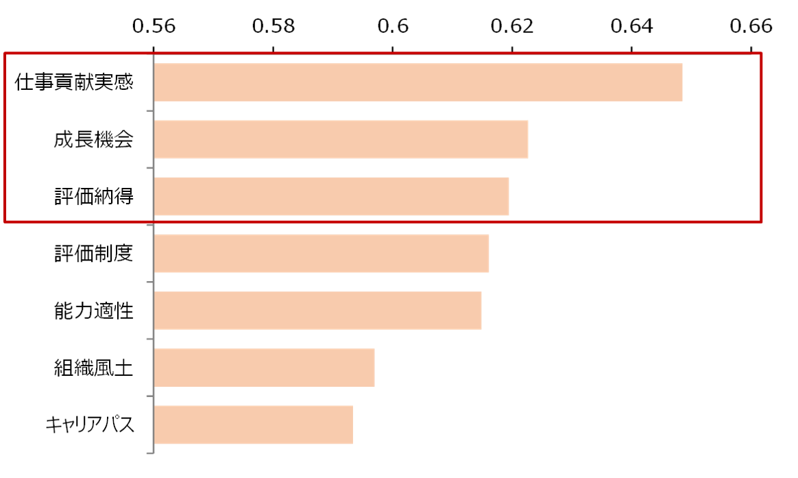 満足度には、仕事貢献度、成長機会、評価納得が特に重要な指標となる。