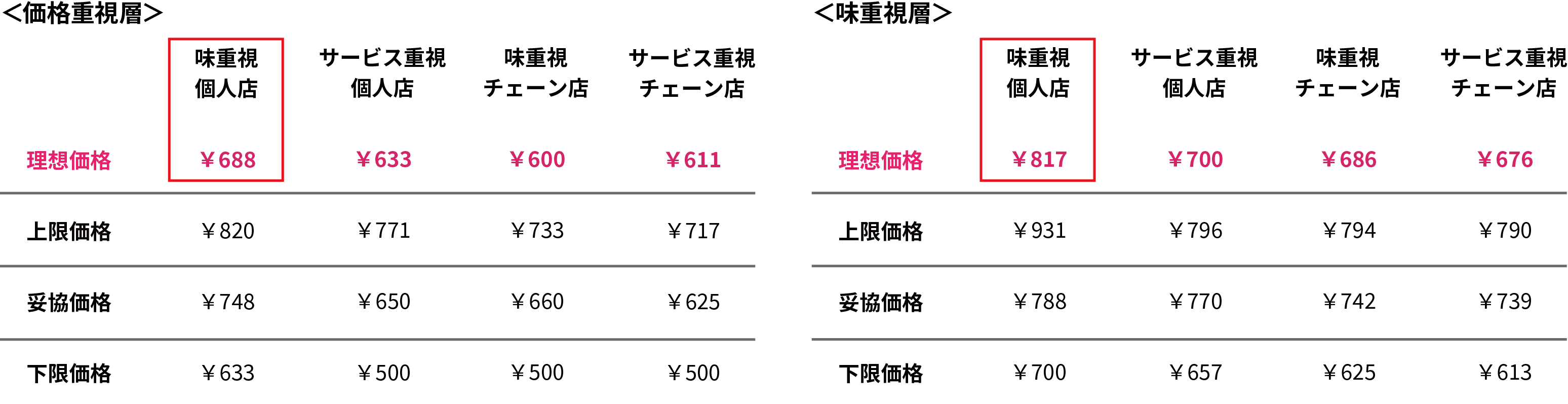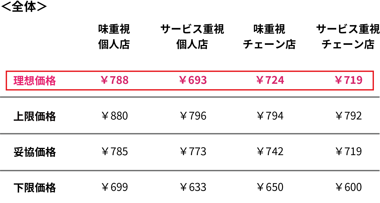 “価格重視層”・“味重視層”ともにチェーン店より個人店のほうが、各価格が高い。