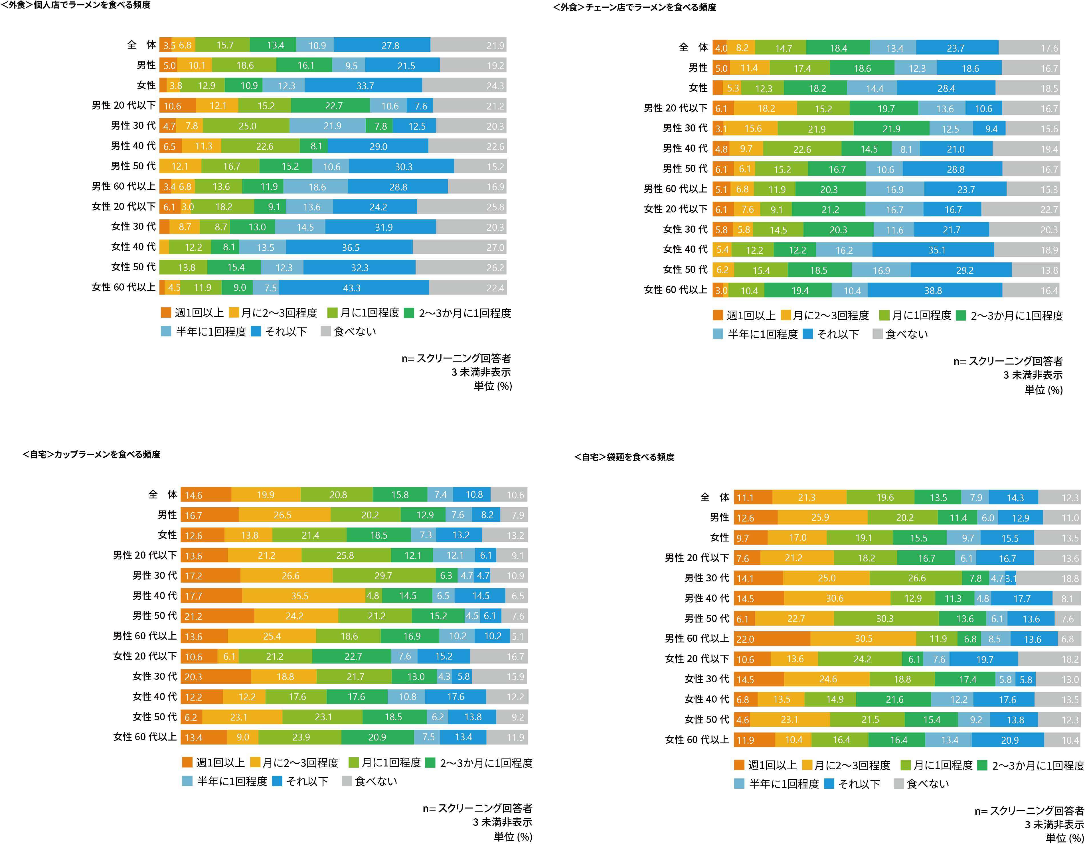 SC4.あなたは普段、「ラーメン」をどのくらいの頻度で召し上がっていますか。それぞれの場面について、召し上がる頻度をお知らせください。(それぞれ1つずつ選択)