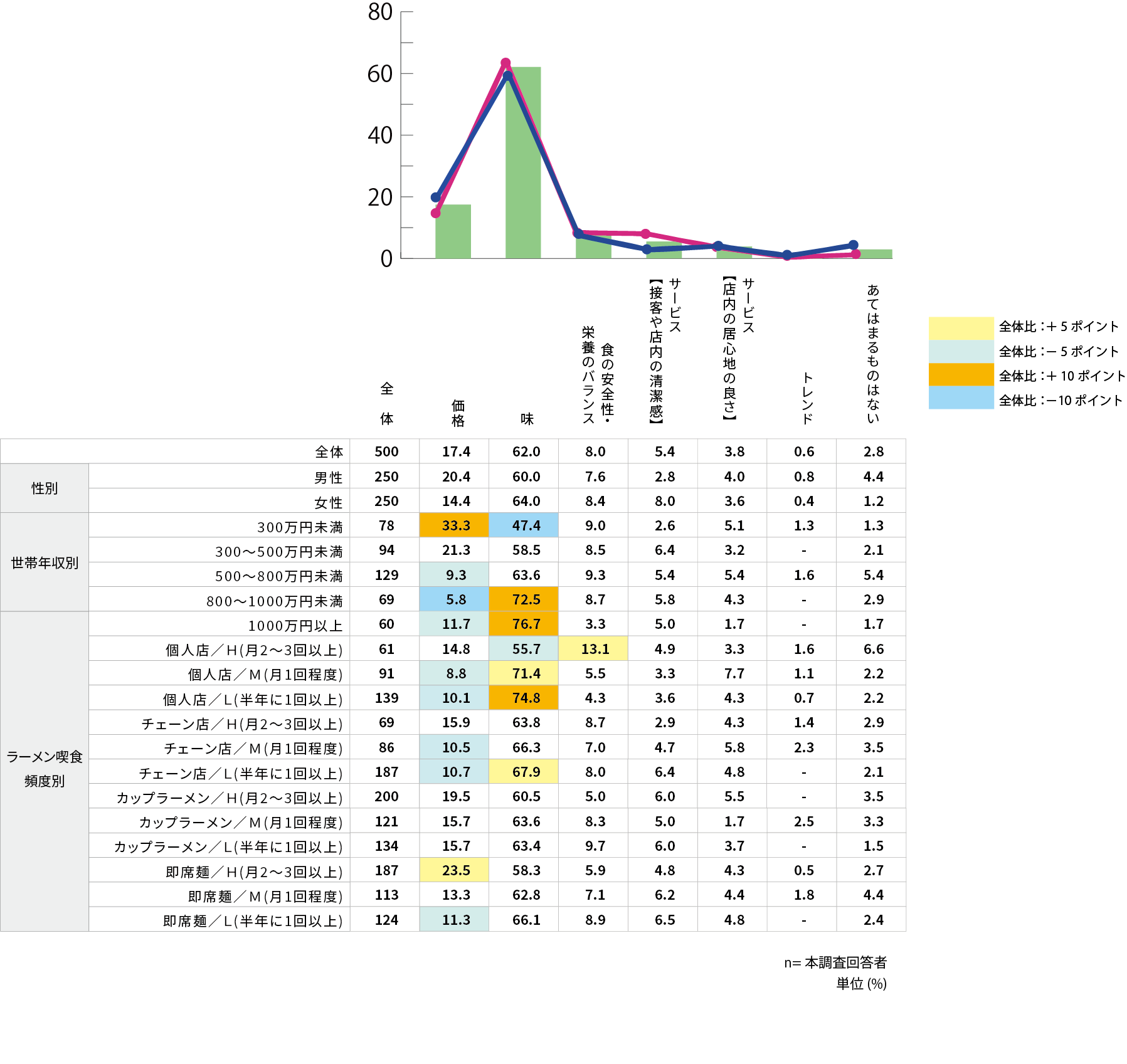 また、世帯年収が“300万未満”は、3割以上が「価格」を重視しており、「味」を重視している人は、半数程度にとどまる。