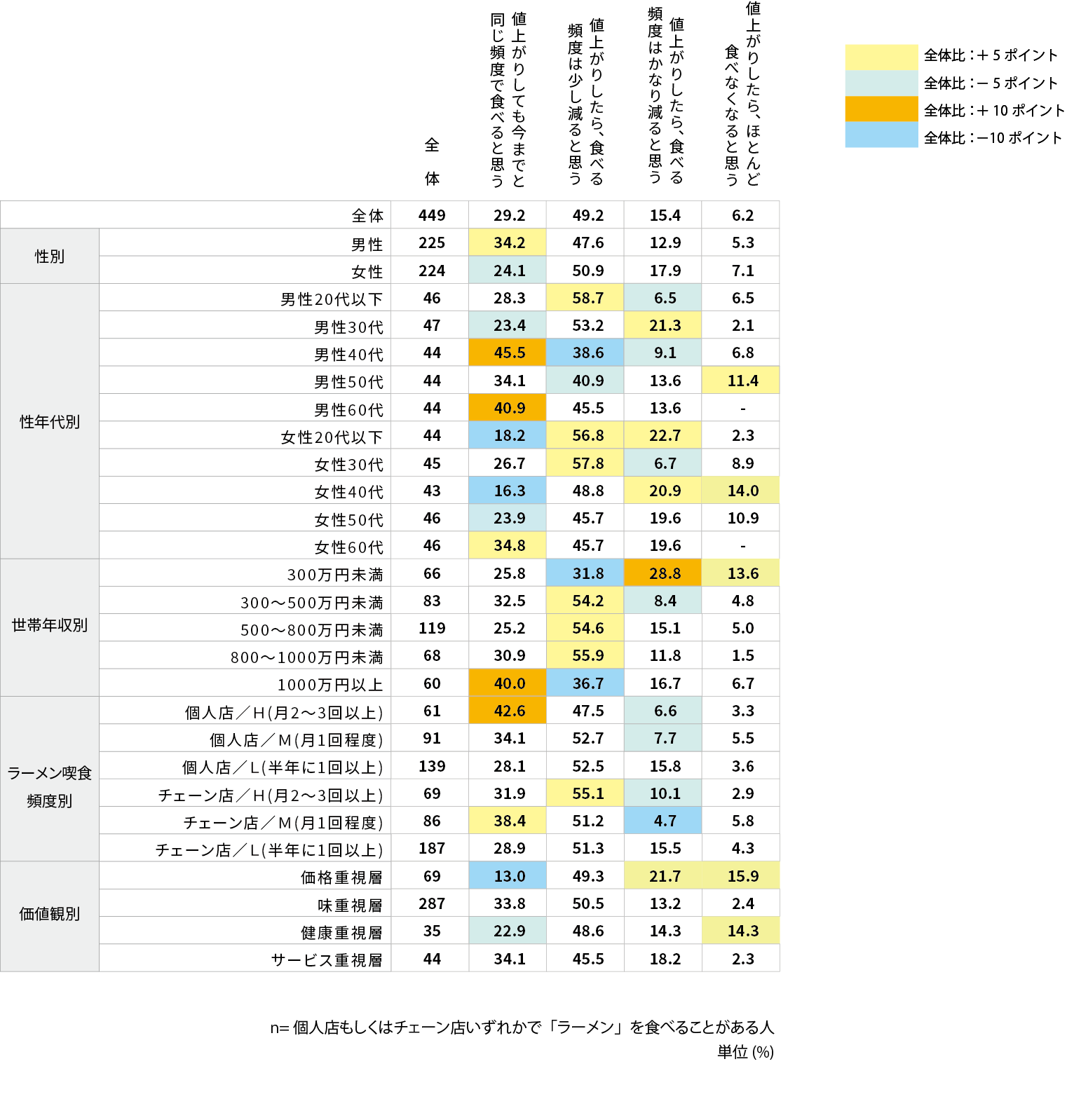 - 味重視の個人店は、他の業態のラーメン店に比べると許容できる価格がやや高い傾向がみられる