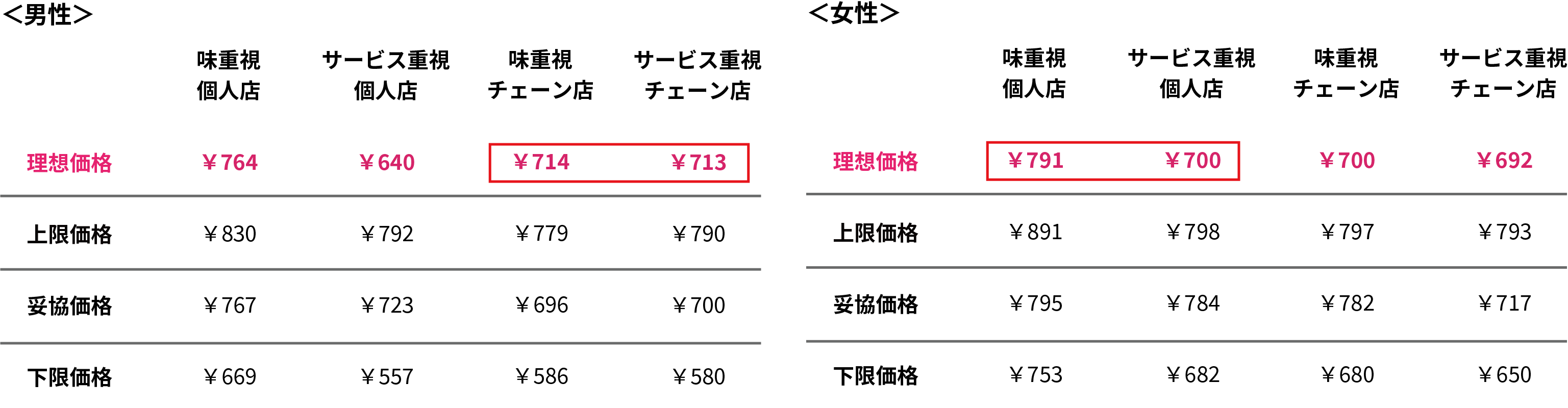 また、“男性”は、“女性”より、食に対して「価格」を重視する傾向があることから、各業態において、上限価格が低い。