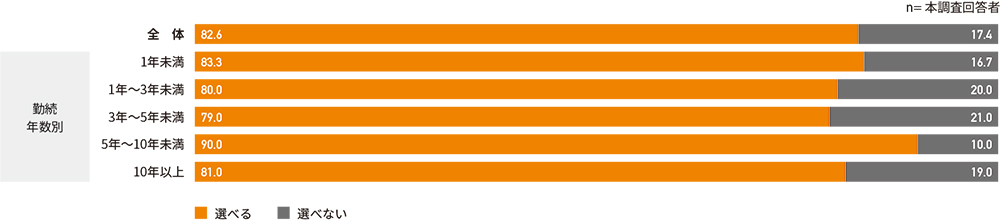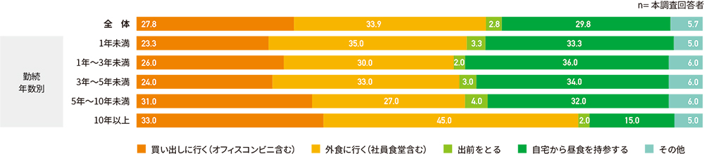 勤続年数が10年未満の層の3割以上が「自宅から昼食を持参する」のに対し、勤続年数が10年以上では顕著に低くなり、反対に「外食に行く(社員食堂含む)」が半数近くまで増える。