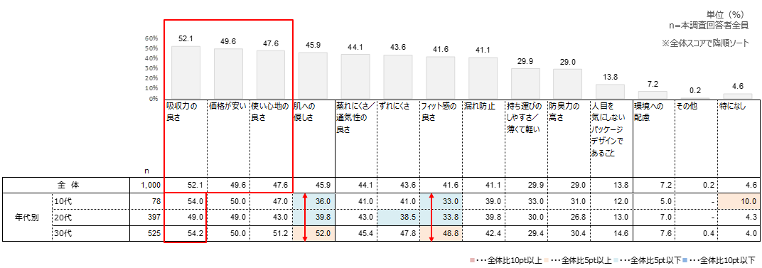 また、30代は「肌への優しさ」や「フィット感の良さ」が全体よりも高い。同項目は10代・20代よりも高い結果。