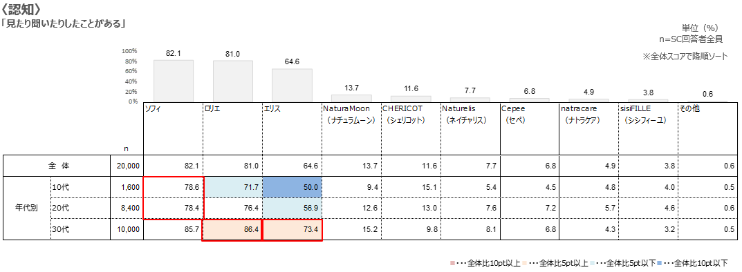 また、10代・20代は「ソフィ」が最も高く、30代は「ロリエ」が最も高く8割半ば。