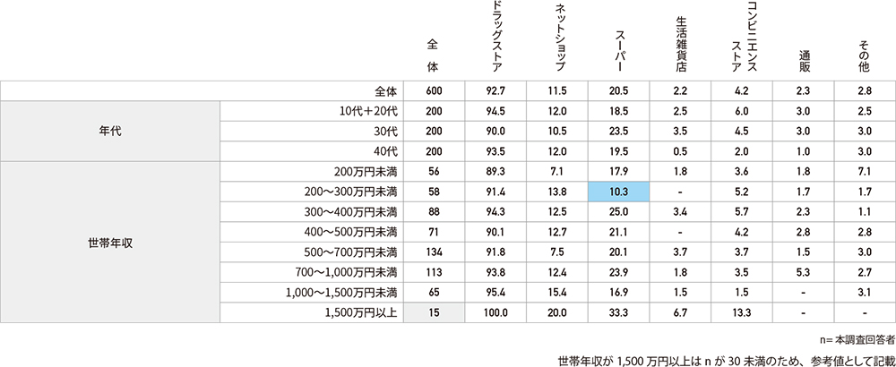 - 生理用品購入場所は「ドラッグストア」の一強。次いで「スーパー」「ネットショップ」の順