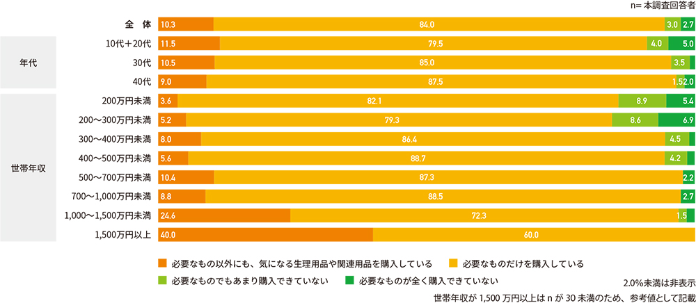 逆に、1,000万円以上の層では、2割以上が「必要なもの以外にも、気になる生理用品や関連用品を購入している」。