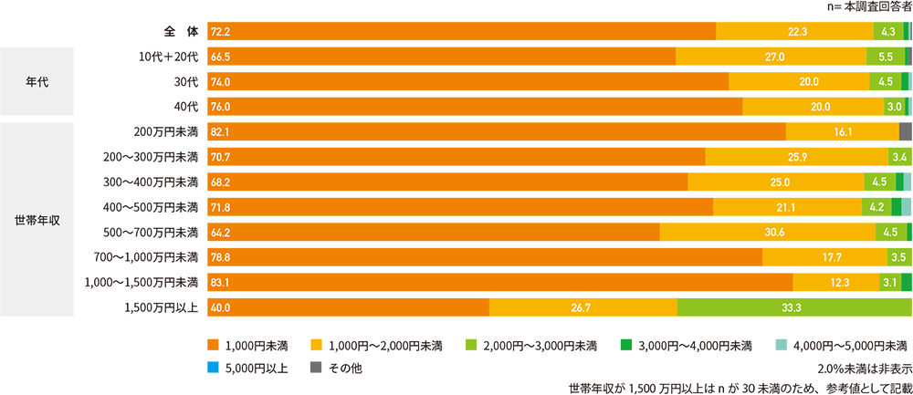 世帯年収別では、200万円未満と700万円以上の層で「1,000円未満」が多い傾向。