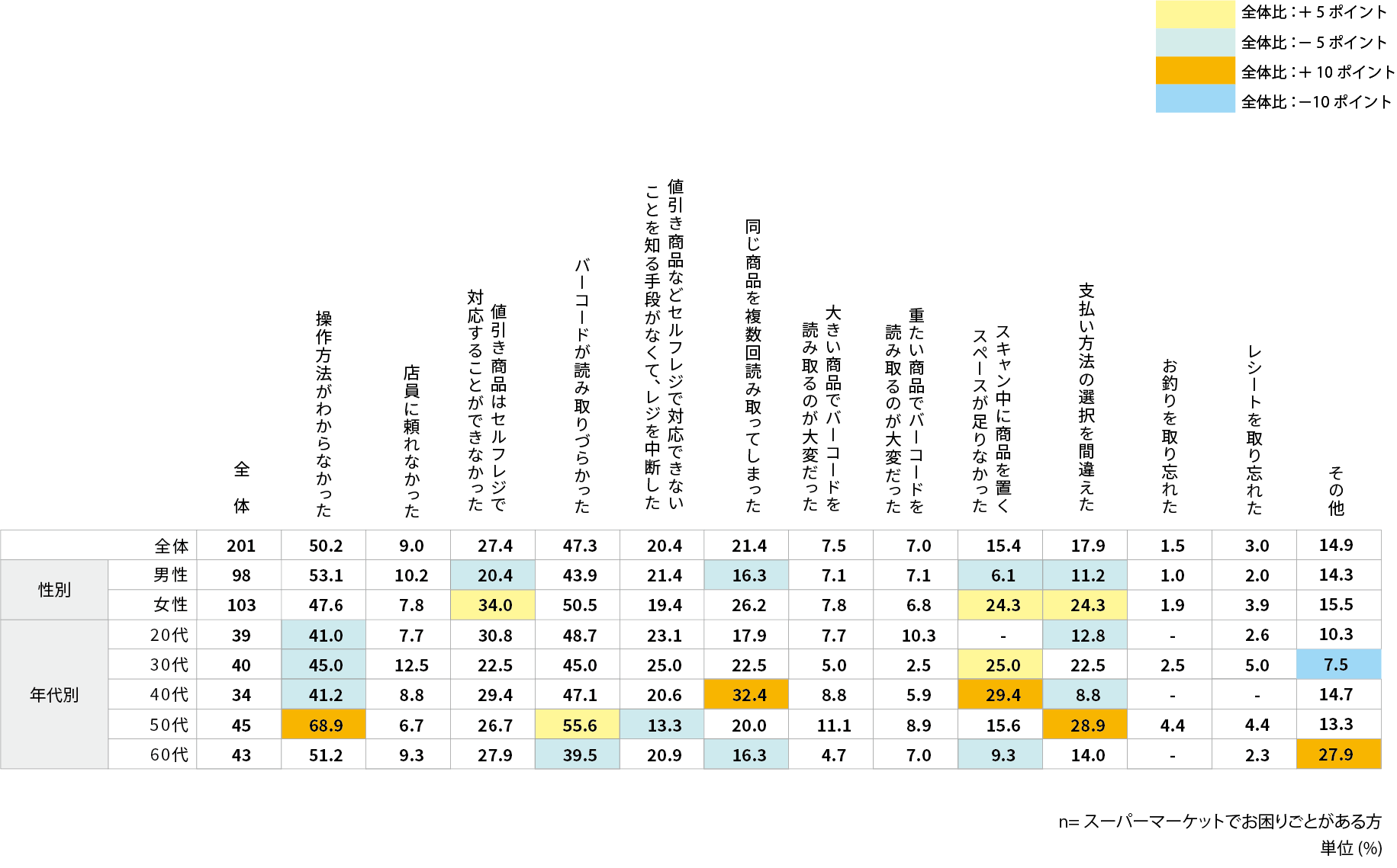 1位「操作方法がわからなかった」では、年代で差があり、特に50代が約69%と、他の年代が約40~50%に対し、多かった。次の2位「バーコードが読み取りづらかった」に関して1位と似ており、50代が約56%と他の年代が約40~50%なのと比べると多かったが、一方で60代は約40%と低かった。そして3位「値引き商品はセルフレジで対応することができなかった」では、性別に差が出た。男性は約20%、女性は34%となり、女性の方が困った割合が多い傾向にあった。