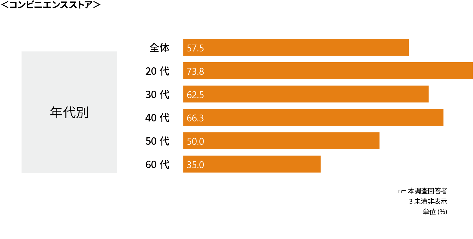 さらに、年代で見てみると、コンビニエンスストアで差が出た。20代が約74%、30代が約63%、40代が約66%、50代が50%、60代が35%と、年代によって割合が異なった。