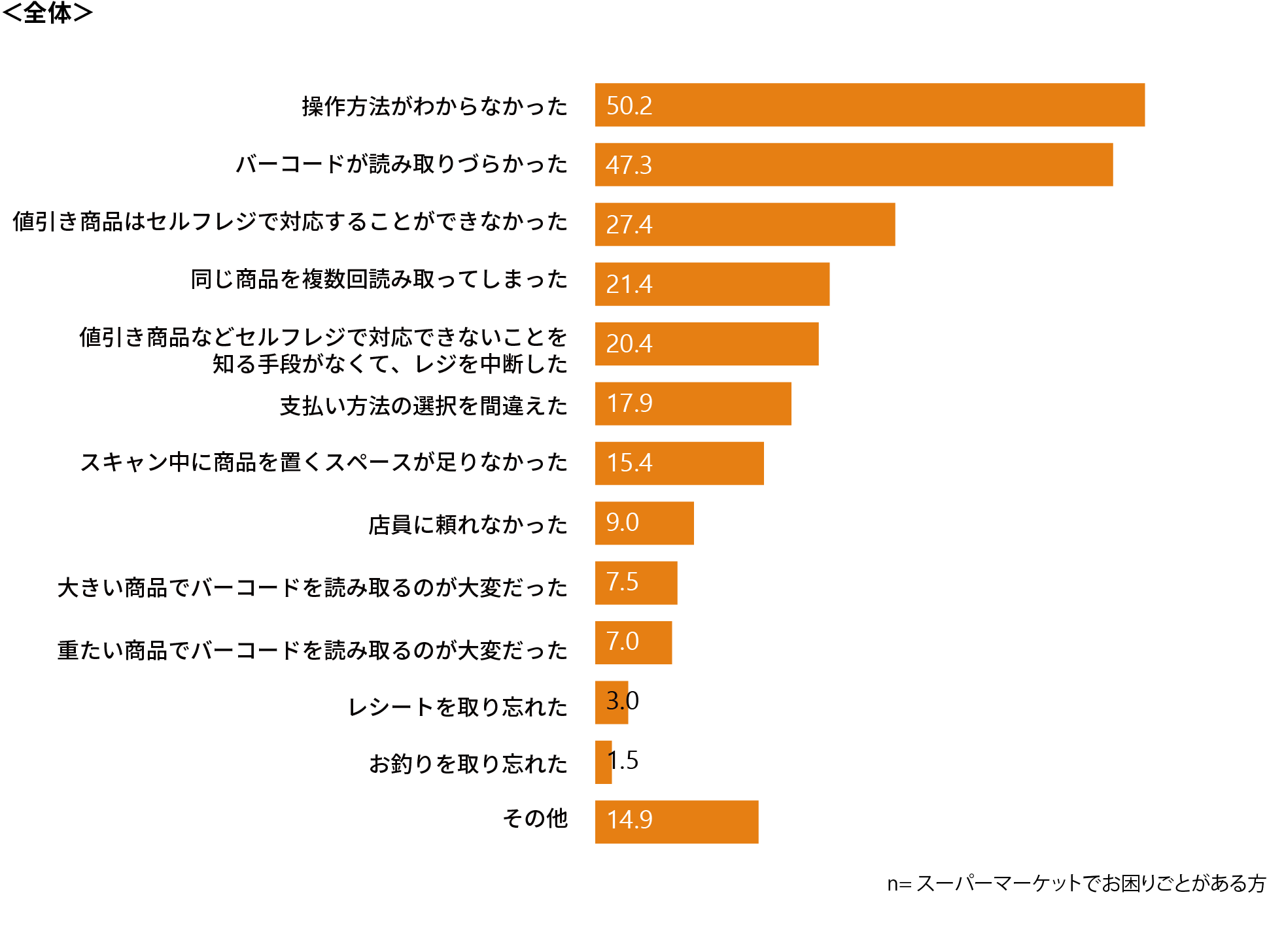 スーパーマーケットのお困りごとTOP3は、1位「操作方法がわからなかった(約50%)、2位「バーコードが読み取りづらかった(約47%)」、3位「値引き商品はセルフレジで対応することができなかった(約27%)」となった。
