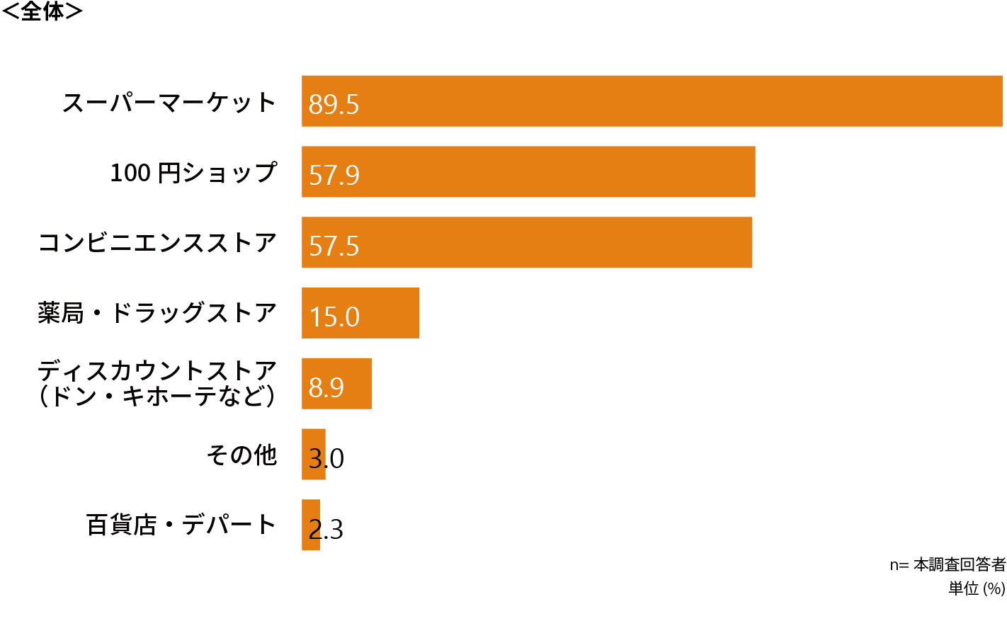 また、性年代別で分析をすると、スーパーマーケットやコンビニエンスストアでは性年代ごとにバラつきは多少あるが、極端な開きはなかった。一方で、100円ショップでは女性60代が約16%と、平均約6%という側面から鑑みると高い回答率となった。