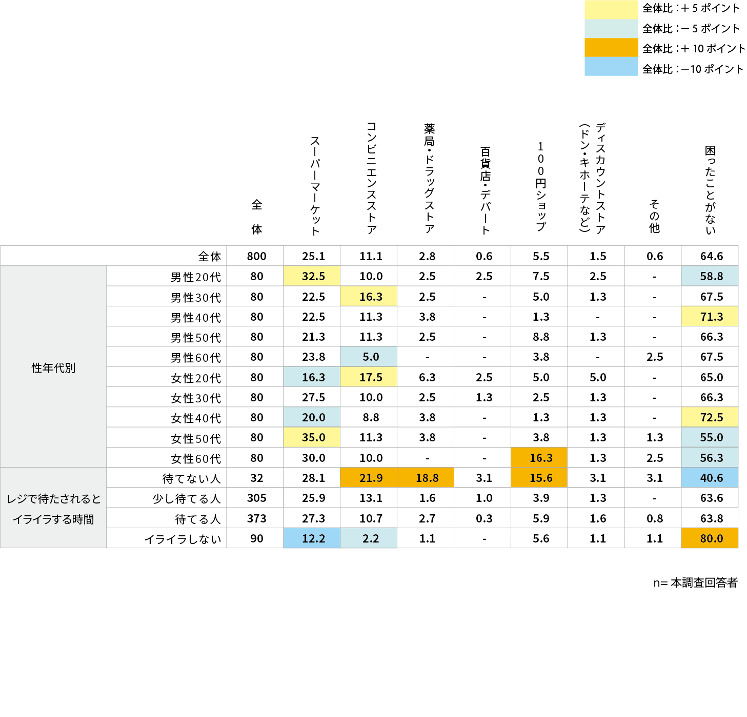 本件では、セルフレジをご自身で利用したことがある方に、お困りごとや印象などを聴取しました。性別や年代のほかに「会計待ちでイライラする時間別」でも分析しております。