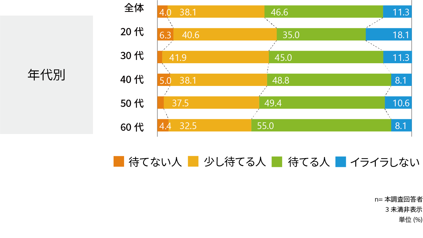 続いて、年代別で見てみると、「待てる人」の割合が、どの年代でも多く、さらに年代が上がるにつれ多い傾向にあった。また、20代は「イライラしない人」の割合が約18%と、他の年代と比べ突出しており、他の年代と1.5~2倍ほど多い割合となった。