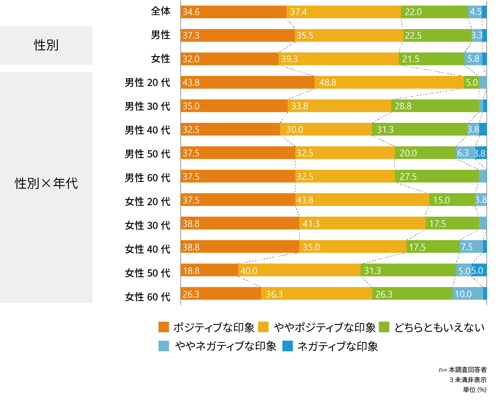 また、「ポジティブな印象」にフォーカスすると、女性50代が約19%、女性60代が約26%と低かった。