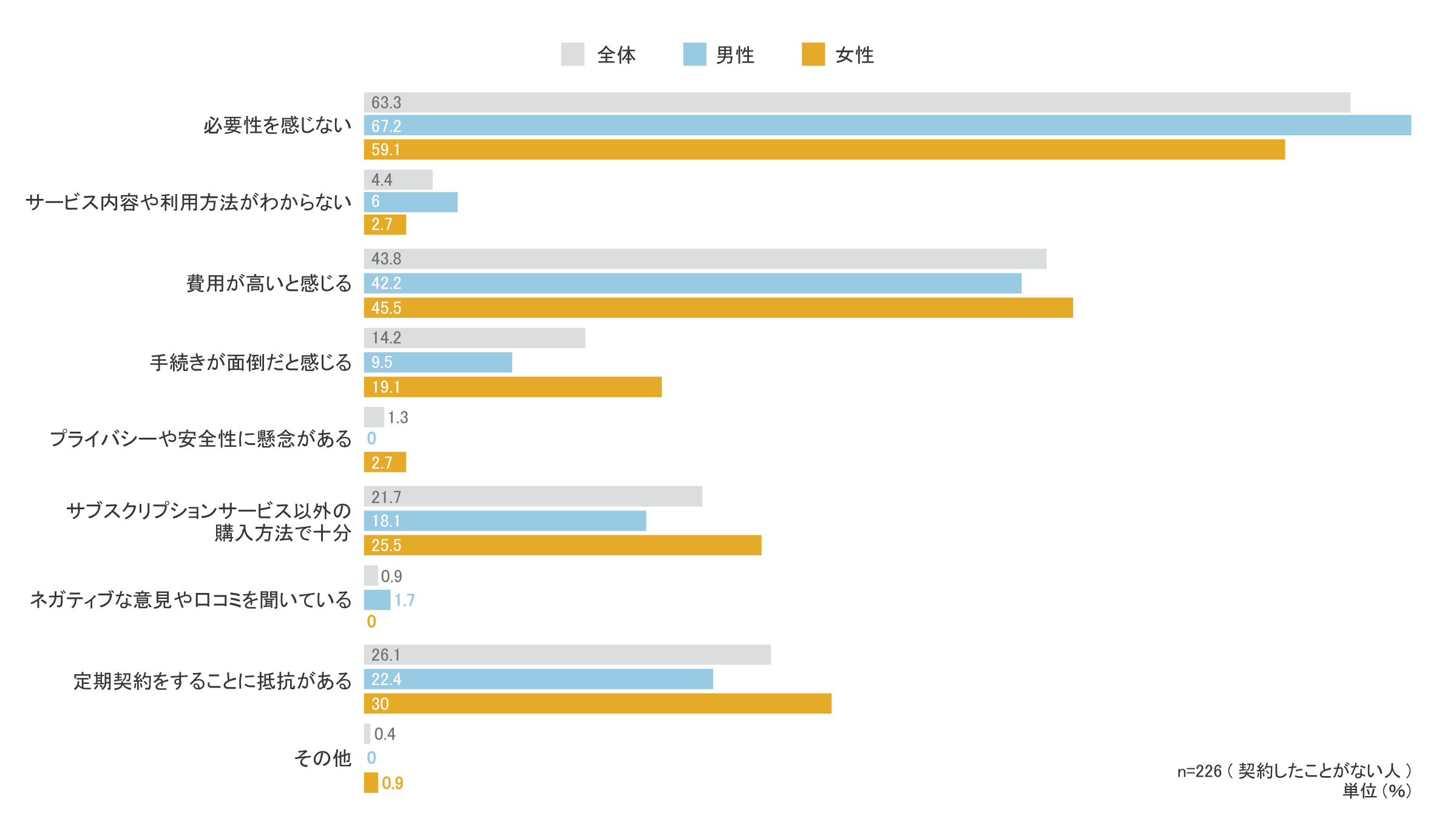 次いで「費用が高いと感じる」、「定期契約をすることに抵抗がある」と経済的な要因や抵抗も大きな理由となっていることが読み取れる。