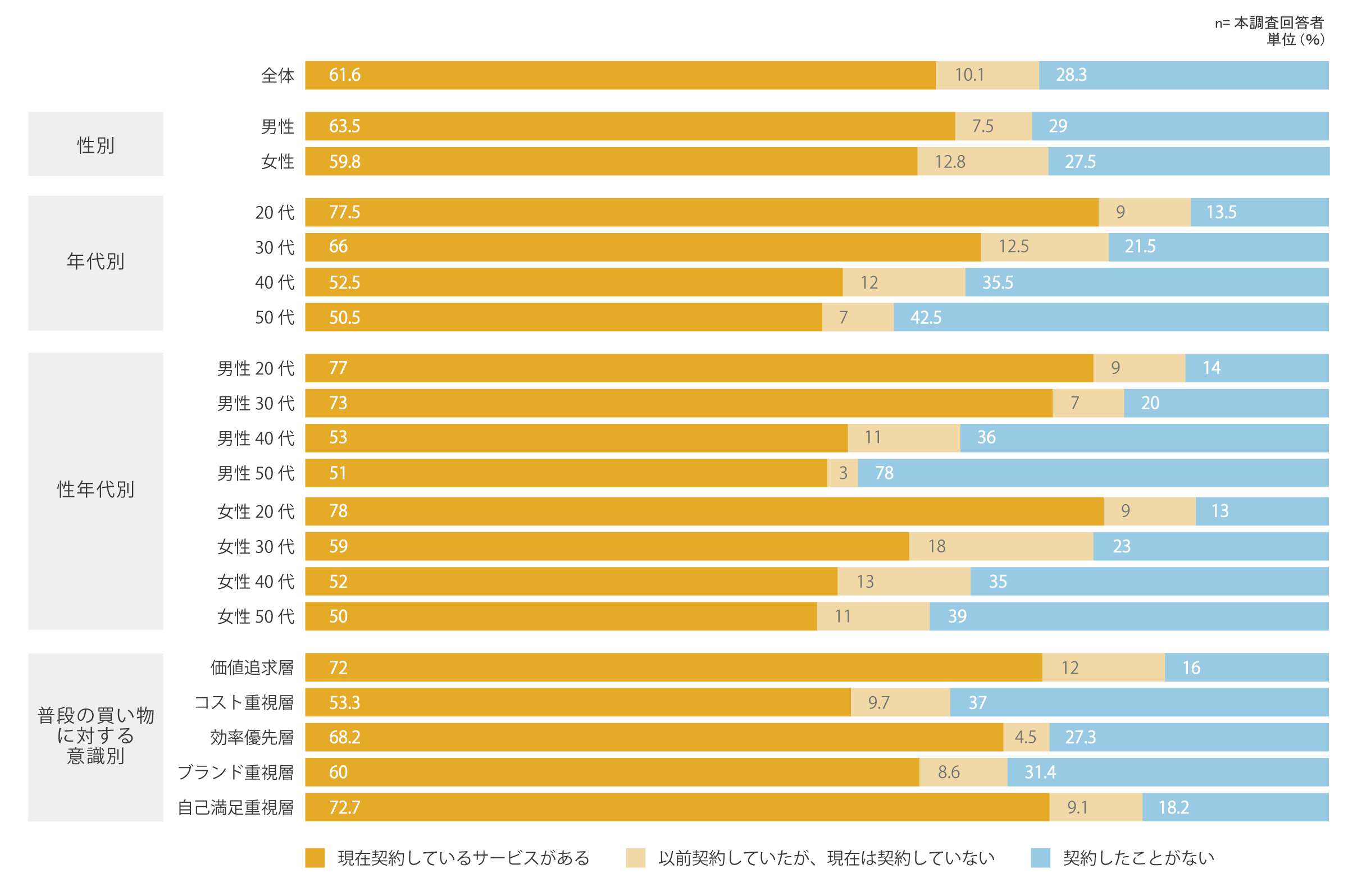 買い物意識別でみると、 “価値重視層”と“自己満足重視層”が 「契約したことがない」人の割合が低く、“コスト重視層”は高い結果となった。利用していなくても料金が発生することや、毎月課金される支払い形式への抵抗感なども関連していると考えられる。